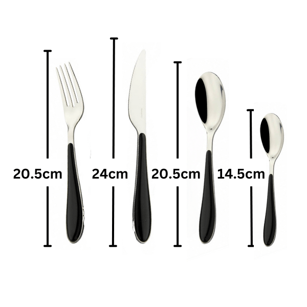 - • 18/10 Stainless Steel , 6x knives: L24cm, 6x forks: L20.5cm, 6x table spoons: L20.5cm, 6x teaspoons: L14.5cm