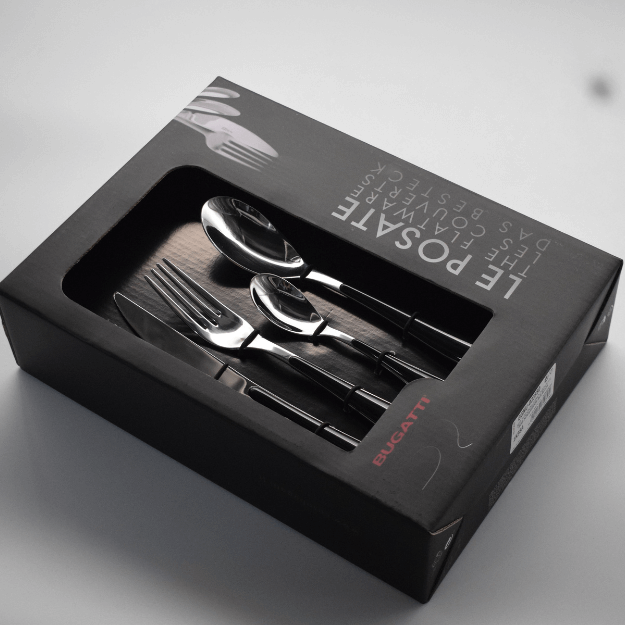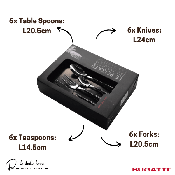 This Flatware from Casa Bugatti GIOIA 24 Pcs Cutlery Set – Black Acrylic Handle – Home Accessories. These Flatware 24 pieces Gioia model, (for 6 Persons) black handle in a litographed box with a window.