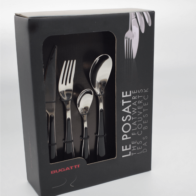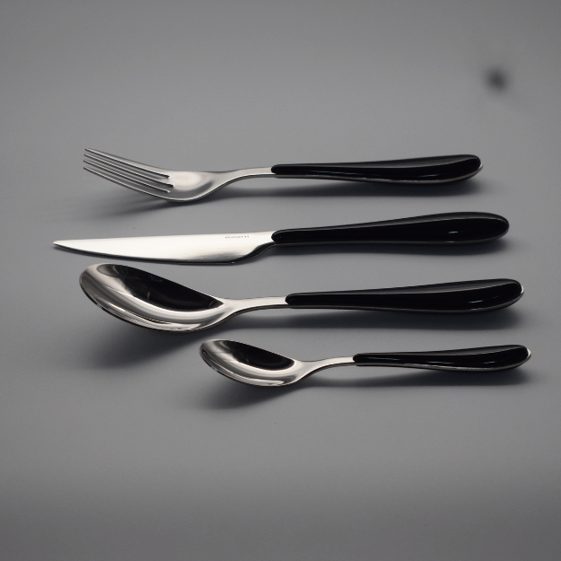 Black Handle cutlery set 24 pieces, Gioia, by Bugatti. Design by Bugatti Technical Office. Set for 6 people by: 6 knives, 6 tablespoons, 6 forks, and 6 teaspoons. Cutlery in stainless steel 18/10 with Black ABS handle. Dishwasher safe. Packaged in a lithographed box with a window.