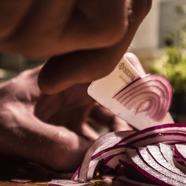 Ceramic blades are made from Kyocera’s proprietary zirconia material produced in Japan for exceptional quality and beauty. Lightweight and easy to clean, the blades will not brown food and are rust-proof, and resistant to acids. Ultra-sharp advanced ceramic blades will maintain their edge up to 10X longer than steel blades. Ideal for slicing vegetables and boneless meats. NOT to be used on hard or frozen foods. Dishwasher safe