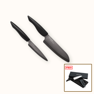 Kyocera’s most popular ceramic kitchen knife set includes two Revolution Series knives for any home cook preparing fresh meals. The 16 cm Santoku is an all-purpose knife for everyday slicing tasks of fruits and vegetables. The 11 cm Utility knife is perfect for precise cutting and straight cuts.